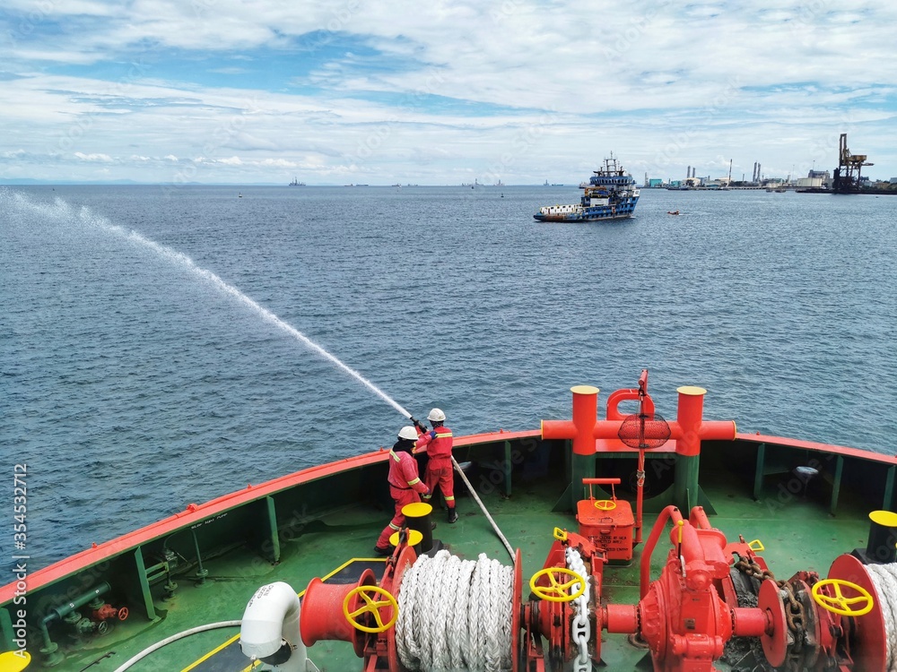Obraz na plátně Marine crew conducting fire drill and tested fire hydrant pump on board a marine offshore vessel