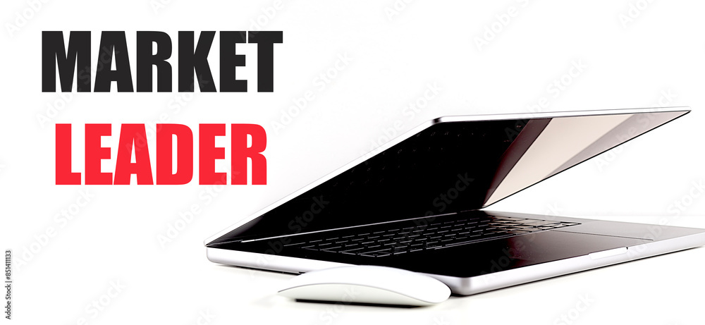 Fotografie MARKET LEADER text on white background with laptop and mouse