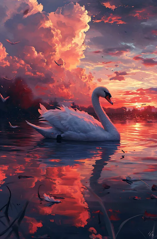 Samolepka A graceful swan drifting on a calm, mirror-like lake