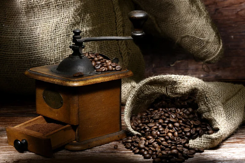Obraz na plátně A vintage coffee grinder near a jute back with beans
