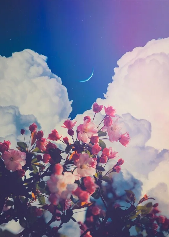 Plakát Aesthetic pink Flowers crescent moon clouds blue sky