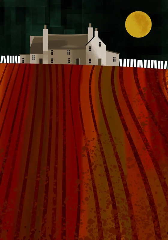 Samolepka An old farmhouse sits atop a ploughed field as a yellow moon