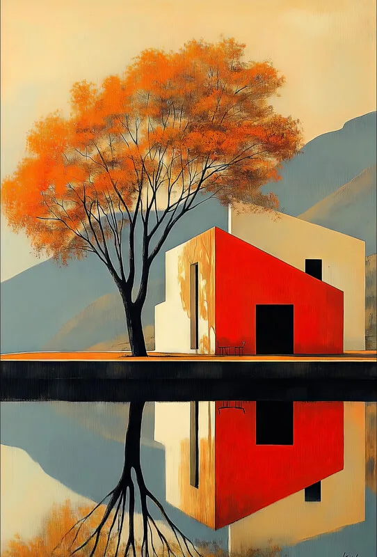 Samolepka Autumn Red House, Orange Willow Tree, contemporain Wall Art