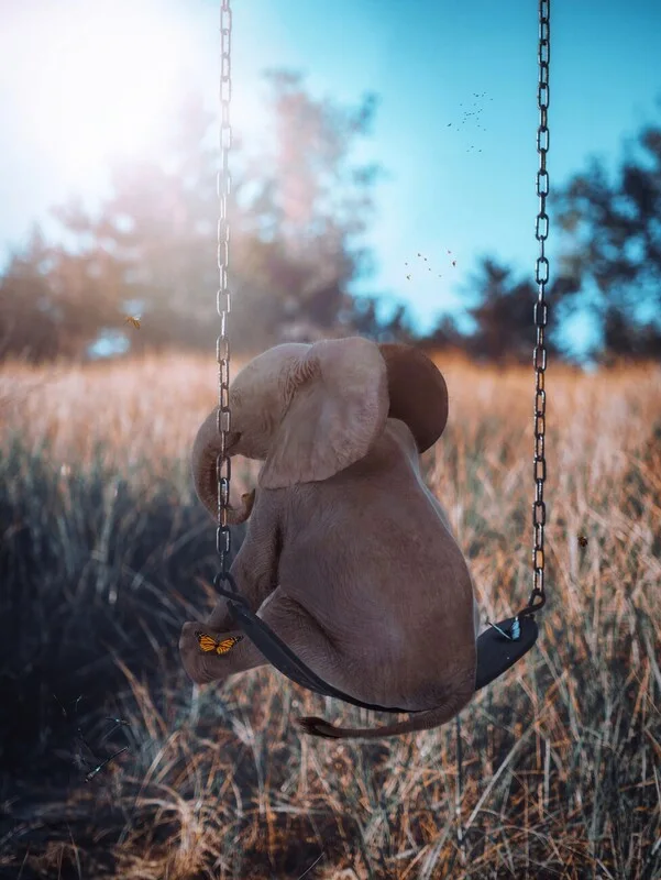 Obraz na plátně Baby Elephant on Swing with Butterflies