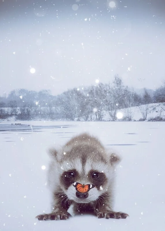 Obraz na plátně Baby raccoon under snow with orange butterfly