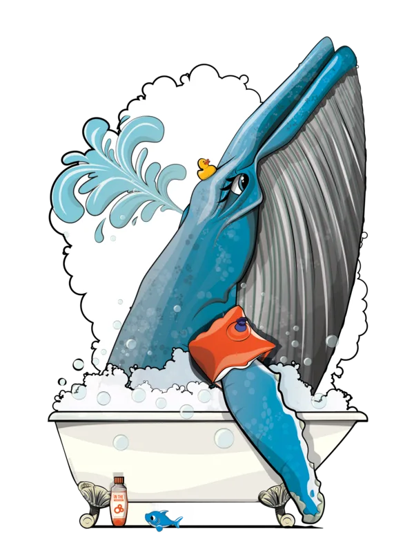 Blue Whale in the Bath, funny illustration of this sea creature having a wash! Part of our set of bathroom ocean animals set.