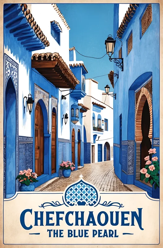 Samolepka Chefchaouen Poster – Vintage Moroccan Blue Pearl Art Print
