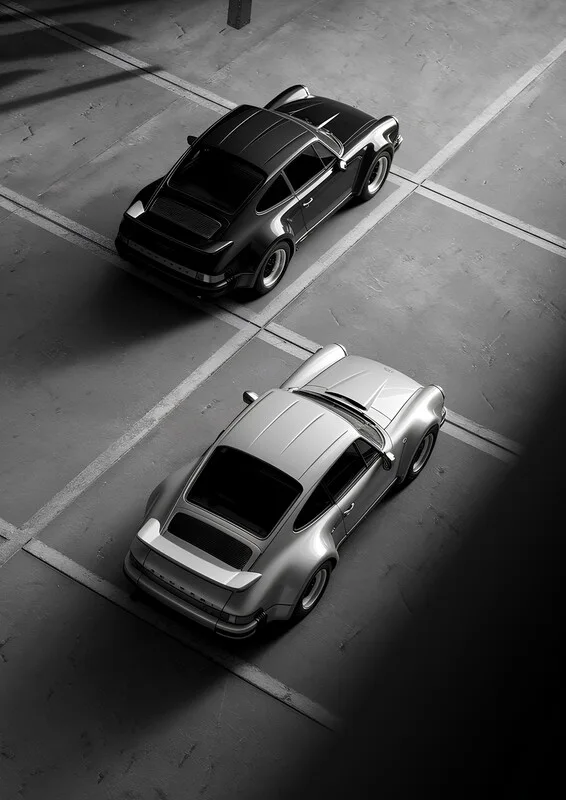 Obraz na plátně Contrasting Classics: Black and Silver Porsche 911s in Urban