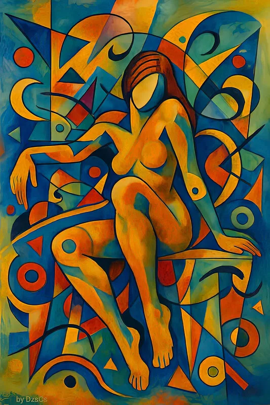 Samolepka Cubist Nude Figure in Blue & Golden Abstraction, Wall Decor