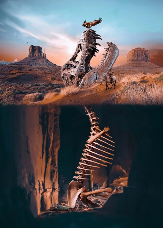 Obraz na plátně Dinosaur skeleton and the Indian man on Horse