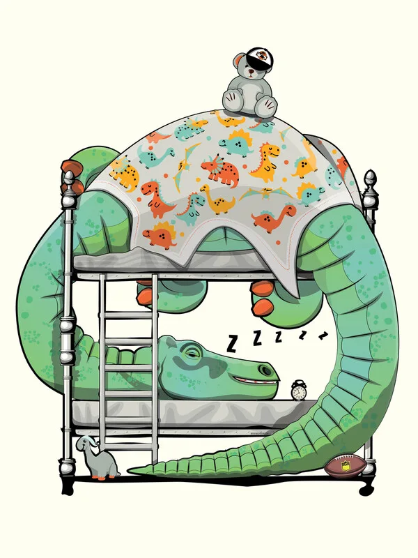 Diplodocus dinosaur sleeping in bed. Fun children's bedroom poster, perfect for encouraging your little ones to fall asleep. Part of our col