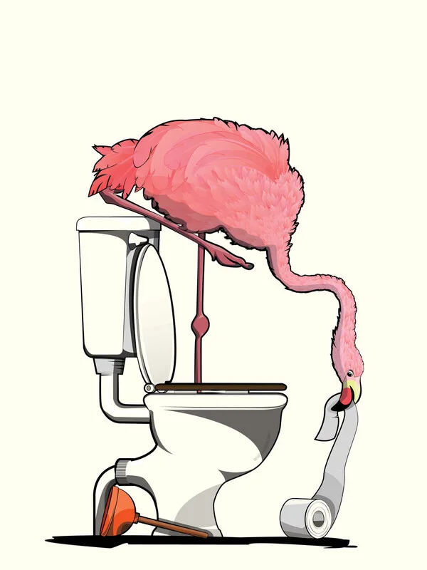 Flamingo on the Toilet, funny artwork for your WC, guest bathroom or en suite. A little bit of an African Safari for your bath wall.