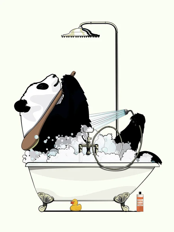 Giant Panda Bear in the Bath, funny illustration of a bear in the Bathtub taking a shower! Part of our set of Jungle bathroom animals set.