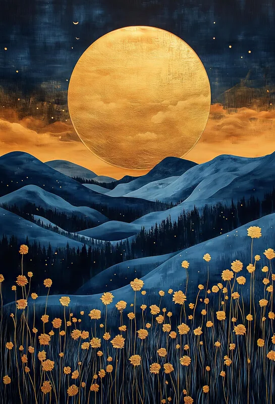 Obraz na plátně Golden Harvest Moon, Cobalt Valley & Flowers, bedroom Wall