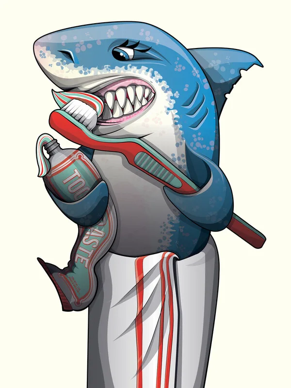 Great White Shark brushing teeth, funny illustration of a sea creature brushing teeth. Part of our set of bathroom ocean animals set!