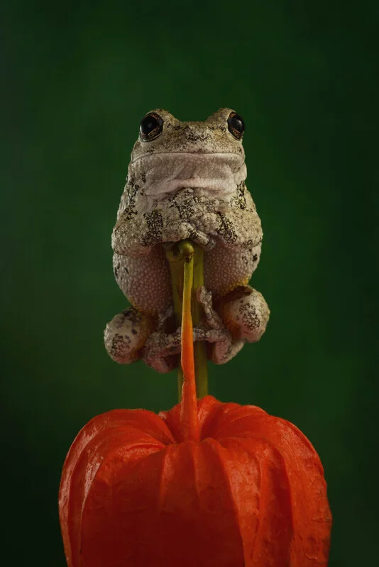 Obraz na plátně Greys tree frog sat on Chinese lantern plant