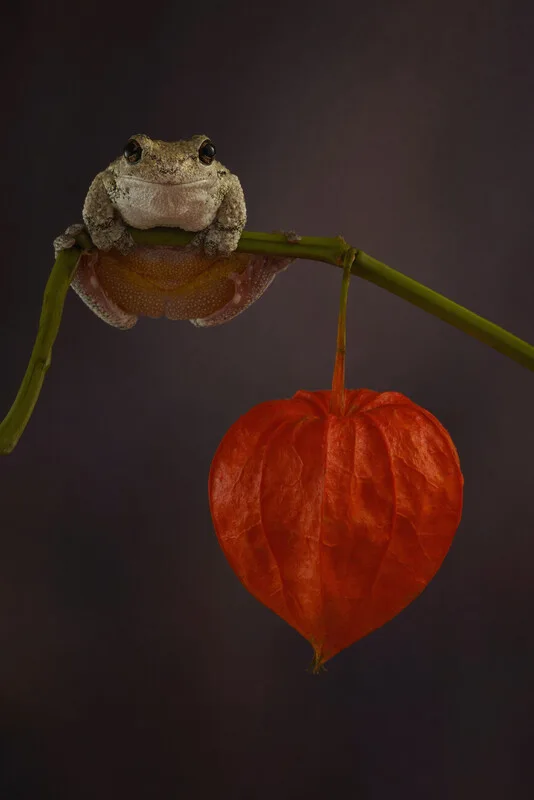 Samolepka Greys tree frog sat on Chinese lantern plant