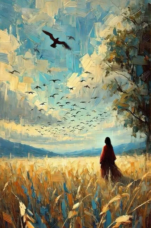 Samolepka Impasto Field Woman Watching a Flock of Birds, wall Art