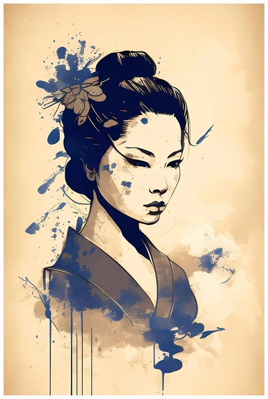 Obraz na plátně Japanese Geisha : Serenity and grace on blue black Ink