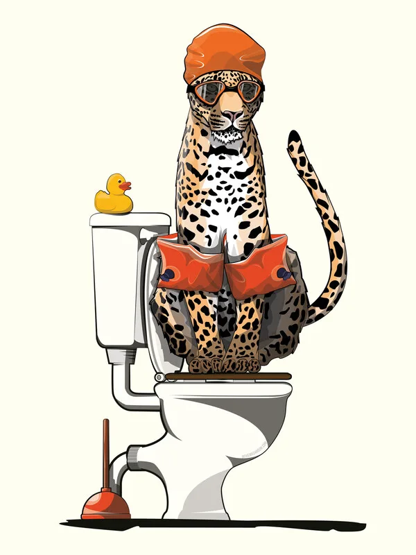 Leopard on the Toilet, funny artwork for your WC, guest bathroom or en suite. A little bit of an African Safari for your bath wall.