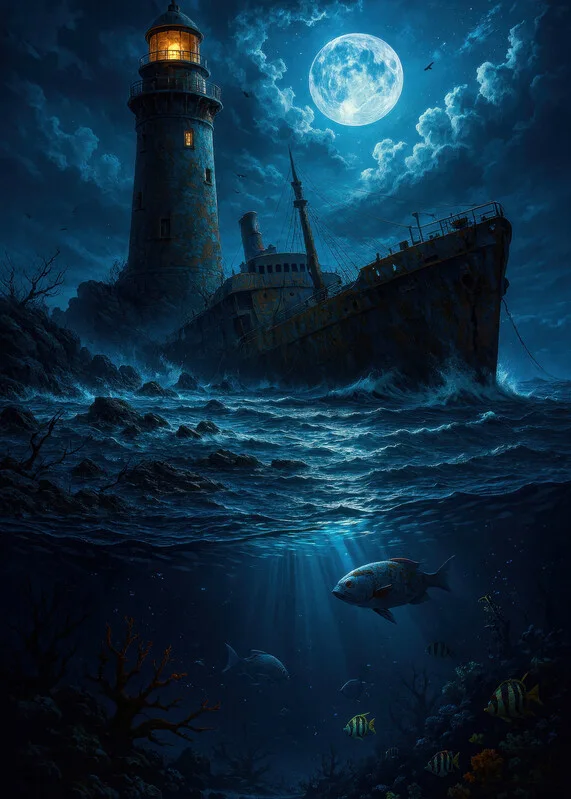 Samolepka Moonlit Shipwreck by the Haunted Lighthouse
