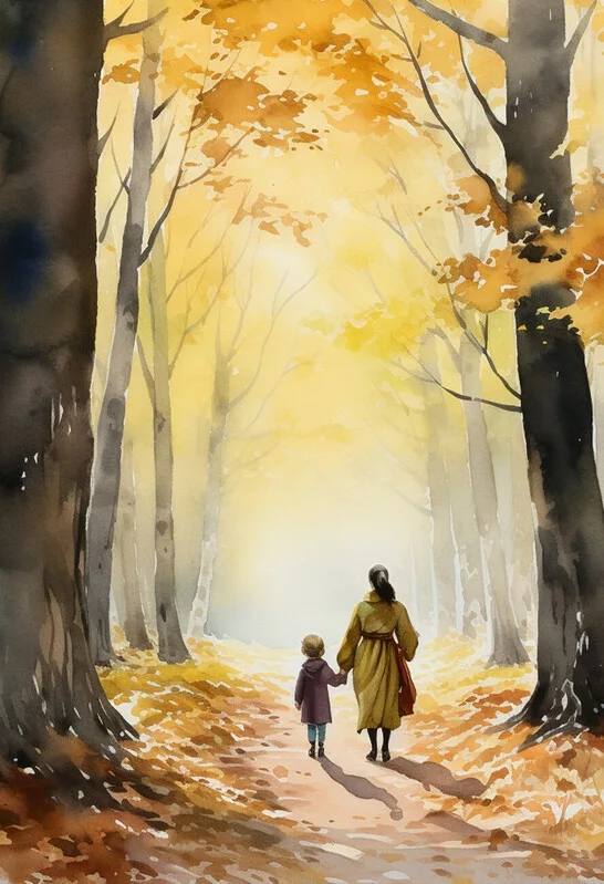 Obraz na plátně Mother and Kid Walking through Forest, October Paint
