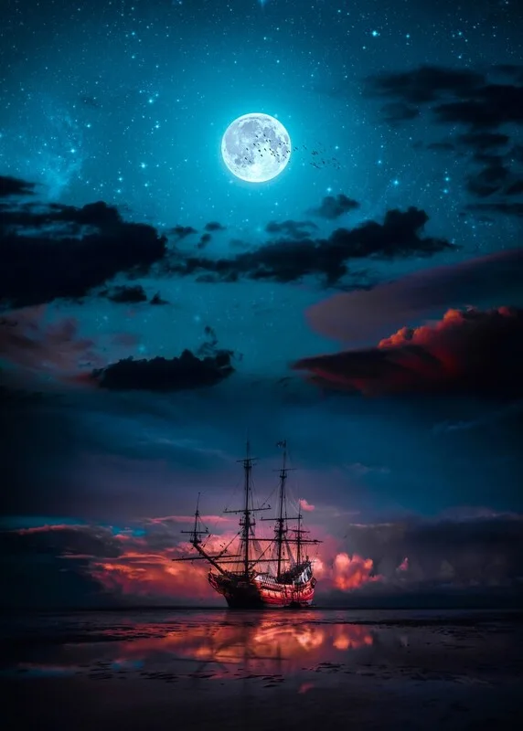 Samolepka Pirate ship on the sea and full moon in the clouds