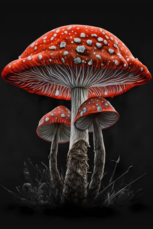 Obraz na plátně Poisonous Red Mushrooms on Black Background