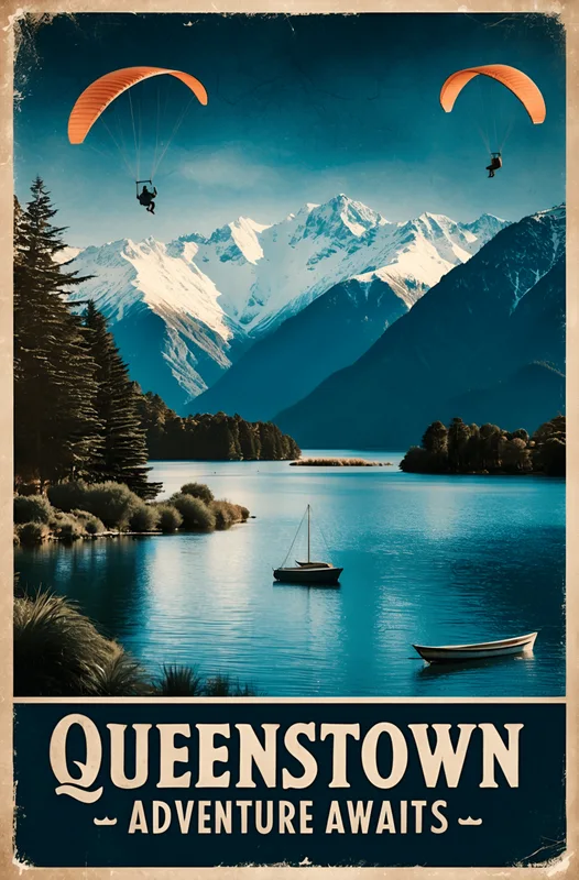 Plakát Queenstown New Zealand Poster – Vintage Adventure Art Print