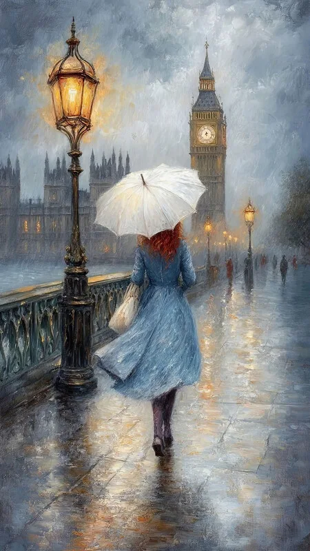 Samolepka Rainy Day Stroll by Big Ben under the Lamplight, Wall decor