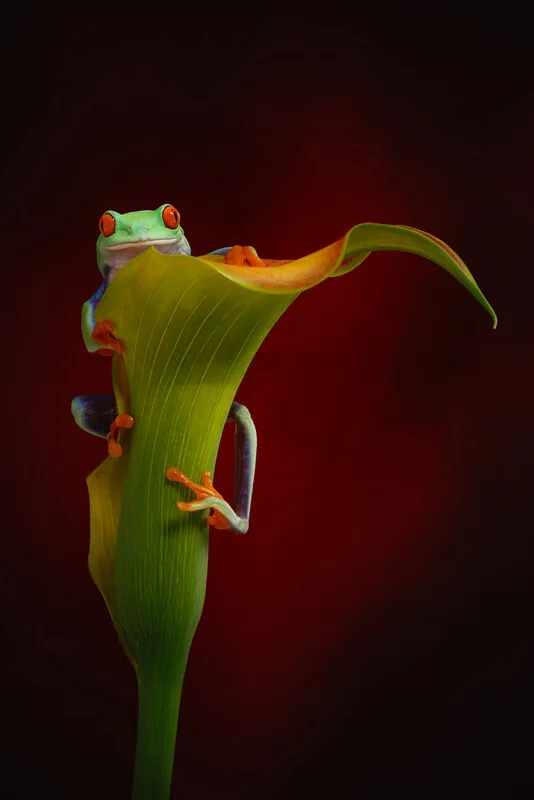 Obraz na plátně Red eyed tree frog on calla lily flower