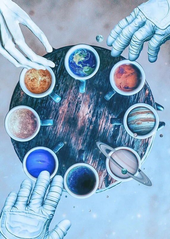 Samolepka Šálky se sluneční soustavou a ruce astronauta a mimozemšťana
