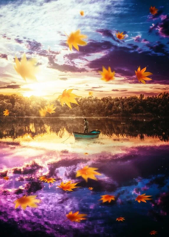 Samolepka Solitary fisherman at sunset night and autumn leaves