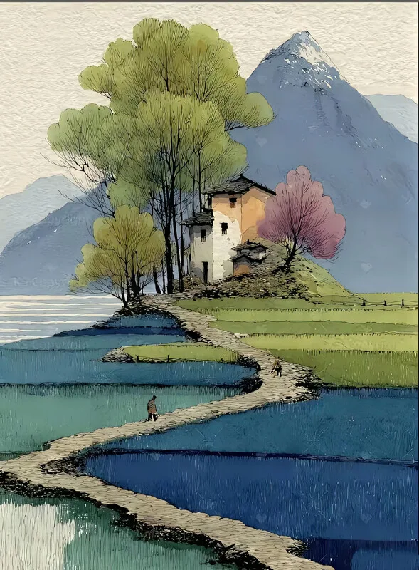 Samolepka Stone Path through Paddy Fields to the House, Room Wall Deco
