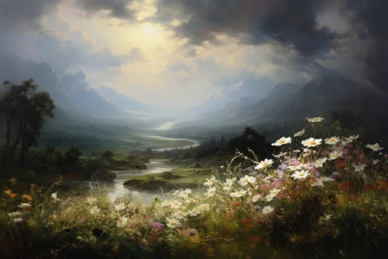 Obraz na plátně Sunlit Valley Blossoms Alpine Serenity