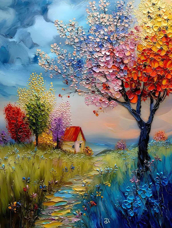Plakát Textured Tree of Four Seasons & a Hidden Cottage wall decor