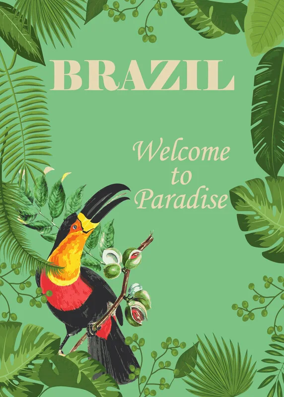 Obraz na plátně Travel poster for Brazil with toucan in the jungle leaves