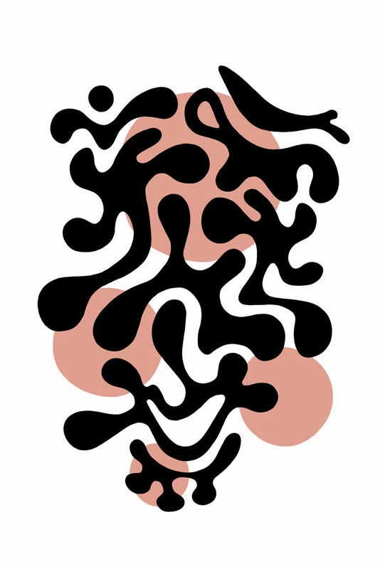 Modern abstract design with flowing, dynamic shapes. A mix of rhythm, floating figures and surreal movements can be discovered.