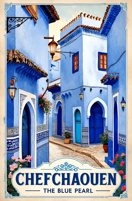 Samolepka Vintage Chefchaouen – Moroccan Blue Pearl Illustration