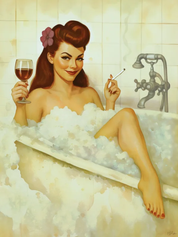 Obraz na plátně Vintage Pin up Girl in Bubble Bath with Wine and Cigarette