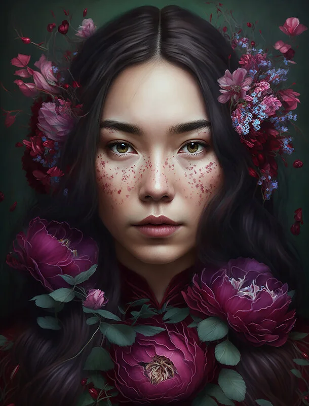 Obraz na plátně Woman portrait in magenta flowers 1.