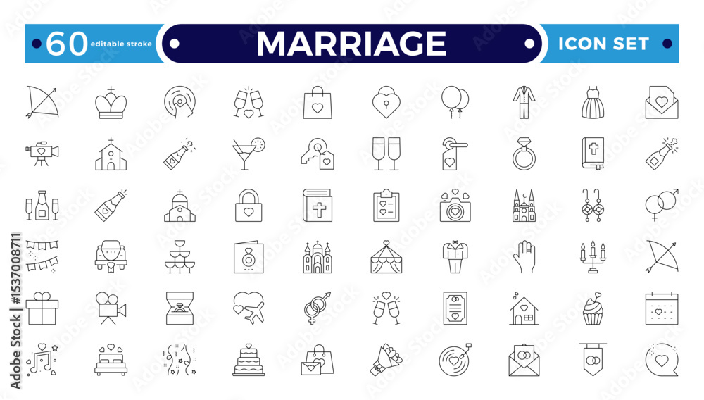 Fotografie Marriage Outline Icon Set – Wedding, Love and Celebration Line Symbols