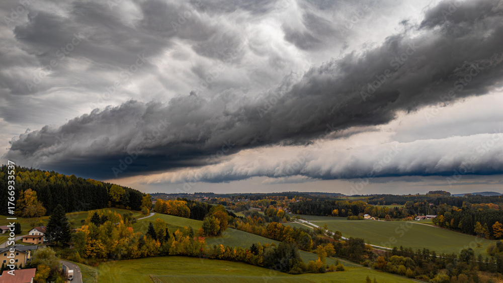 Fotografie Massive storm front with rolling arcus cloud and heavy rainfall passing through
