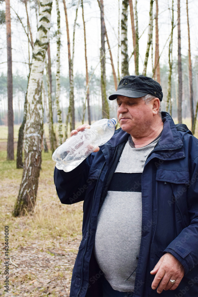 Fotografie Mature caucasian man drinking water in the forest