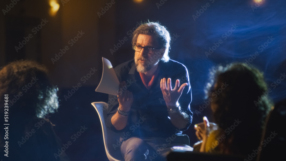 Fotografie Mature director on a dim theater stage talking to the actor and disabled actress