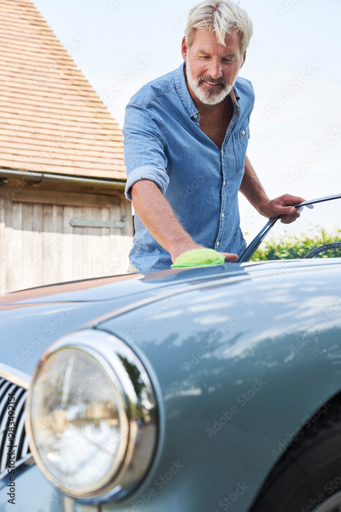 Fotografie Mature Man Polishing Restored Classic Sports Car Outdoors At Home