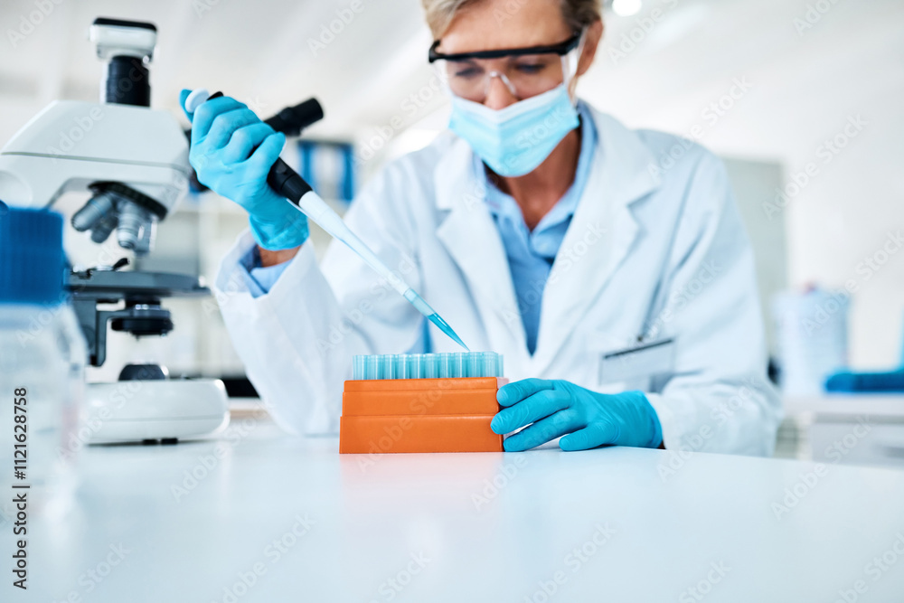 Obraz na plátně Mature woman, scientist and ppe with pipette in science lab for medical research or innovation