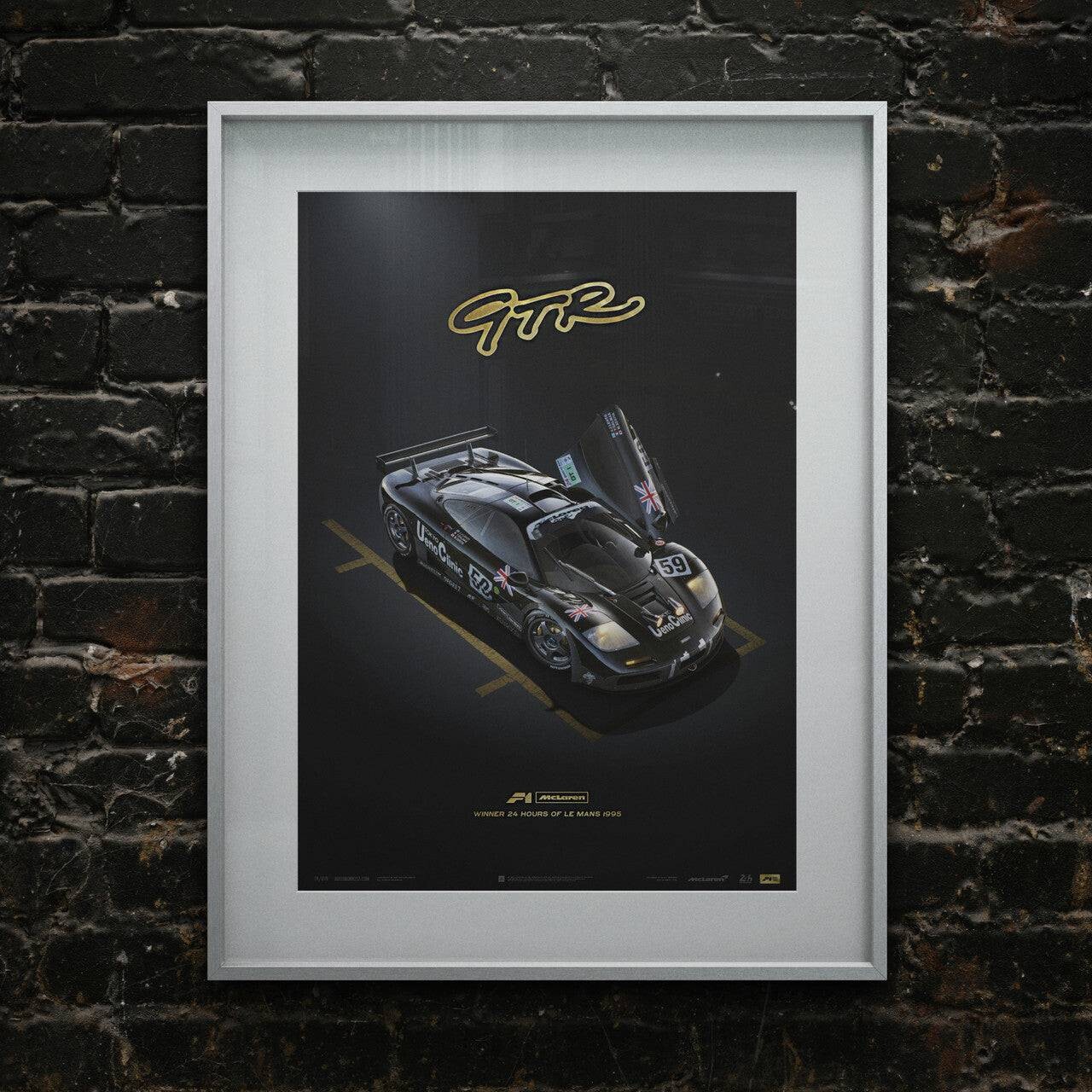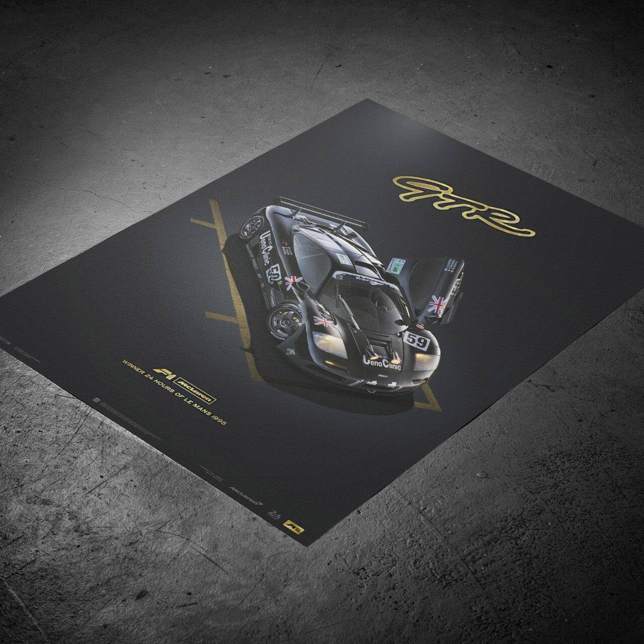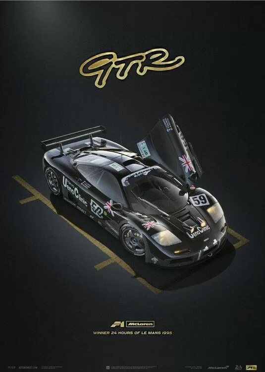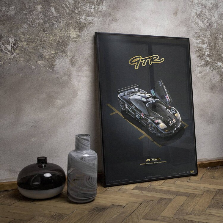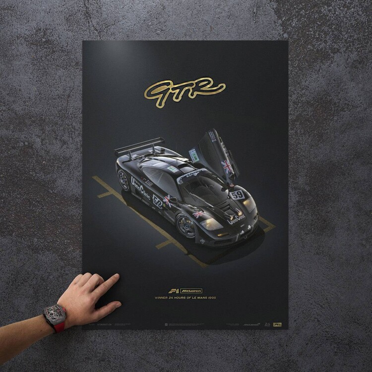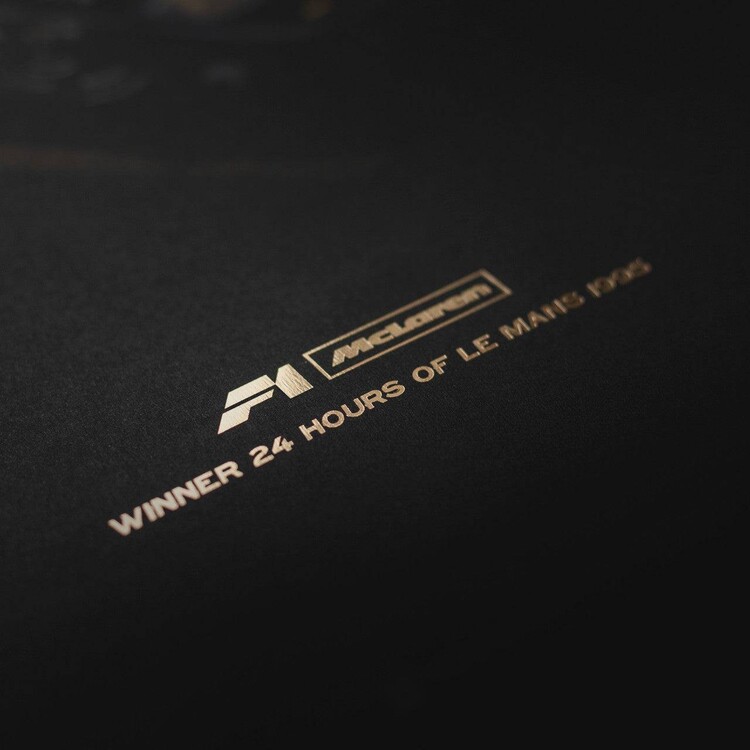 Before the McLaren GTR shook the 1995 Le Mans, no other team had ever captured four of the top five places on a debut appearance. In January of 1995, just six short months before the 63rd Annual 24h Le Mans, Gordon Murray reluctantly agreed to turn the wildly popular McLaren F1 into a proper racing car. Tasked to make this transition from "the ultimate road car” to racing car was the head of GTR Race Development Team James Robinson. Once it was all said and done, 5 teams racing 7 GTR’s were ready to be entered into Le Mans. Of the original 7 GTRs entered at the 1995 Le Mans, two DNF, while the other five placed 1st, 3rd, 4th, 5th, and 13th. This was the most successful debut in history of Le Mans. Limited to only 500 pieces, the Unique & Limited Design poster "Winner” features the McLaren F1 GTR in a parc-fermé position with left side dihedral door open. Each poster is embossed with gold foil highlighting the GTR, F1 McLaren, and 1995 Le Mans type.