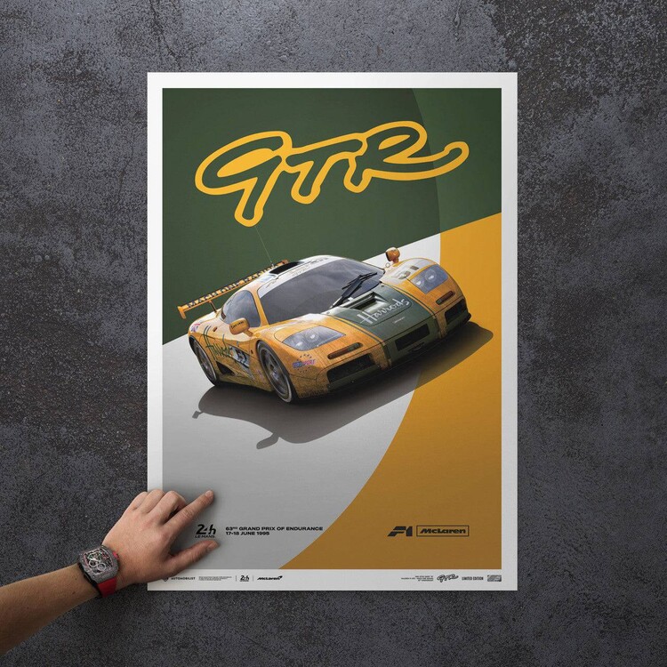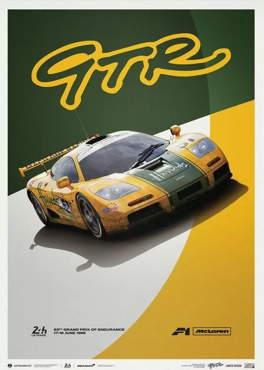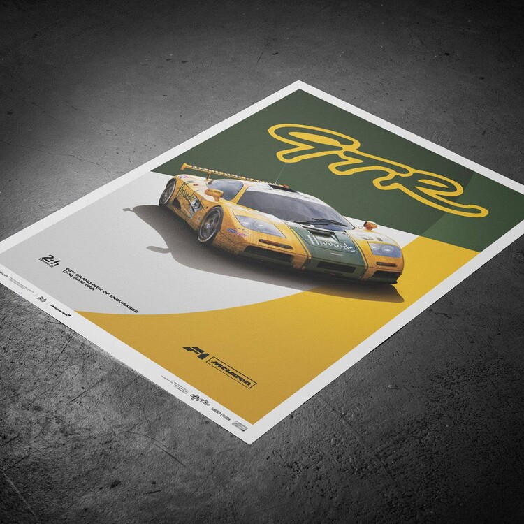 When McLaren Conquered the Year Before the McLaren F1 GTR shook the 1995 Le Mans, no other team had ever captured four of the top five places on a debut appearance. In January of 1995, just six short months before the 63rd Annual 24h Le Mans, Gordon Murray reluctantly agreed to turn the wildly popular McLaren F1 into a racing car. Tasked to make this transition from "the ultimate road car” to racing car was the head of GTR Race Development Team James Robinson. Of the original 7 McLaren F1 GTRs entered at the 1995 Le Mans, four ended up in the Top 5 including car no 51, co-branded by Harrods, that finished third. An all-British entry with a classy driver line-up featuring Andy Wallace, the veteran former F1 driver and five times Le Mans winner Derek Bell and his son Justin. For all of our posters we use high quality off-set printing, premium paper, and vibrant colour reproduction that stands the test of time – just like the cars themselves. Each one is limited and labeled with a special hologram sticker to denote its authenticity.