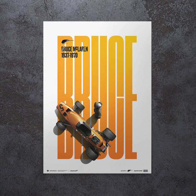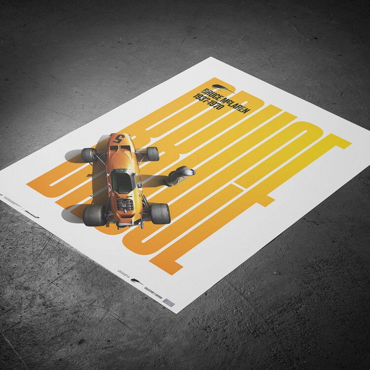 BRUCE McLAREN REMEMBERED On 2 June 1970, a young Bruce McLaren’s growing career was cut short due to an unfortunate incident during testing. The poster features his car from his lone F1® win - in Belgium, at the Spa-Francorchamps Circuit on 9 June 1968. According to the convention of the time, his cars should have been a mix of the New Zealand national colours of green, black and silver, but the papaya was adopted in 1968, when Bruce had begun to see how Americans publicised and marketed their racing activities with bright paint schemes. On the occasion of the 50th Anniversary of his passing, McLaren and Automobilist pay tribute to the charm and charisma of the man who’s name continues to inspire fans worldwide and the team at the Woking facility of McLaren. For all of our posters we use high quality off-set printing, premium paper, and vibrant color reproduction that stands the test of time – just like the cars themselves. Each one is limited and labeled with a special hologram sticker to denote its authenticity.